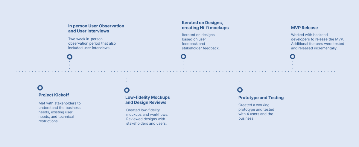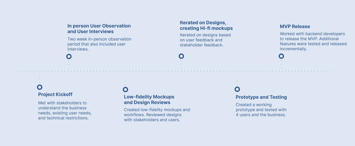 Coming into this project I had no requirements, so it was up to me to define the tasks and document what needed to be done. The vast majority of my research involved interviews and user observation by shadowing multiple customer service representatives. This allowed me to understand their entire process, each task, and their end goals. I was able to discover what features were needed and what problems the legacy system had.
