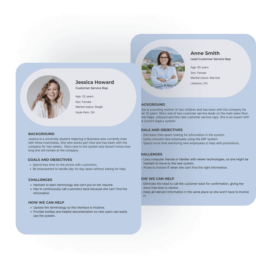 The main users were customer service representatives who handled the sales process from start to finish. There were two types of representatives--the expert and the new employee. Representatives who have been at the company for 10+ years, and new employees who struggled with the legacy system.